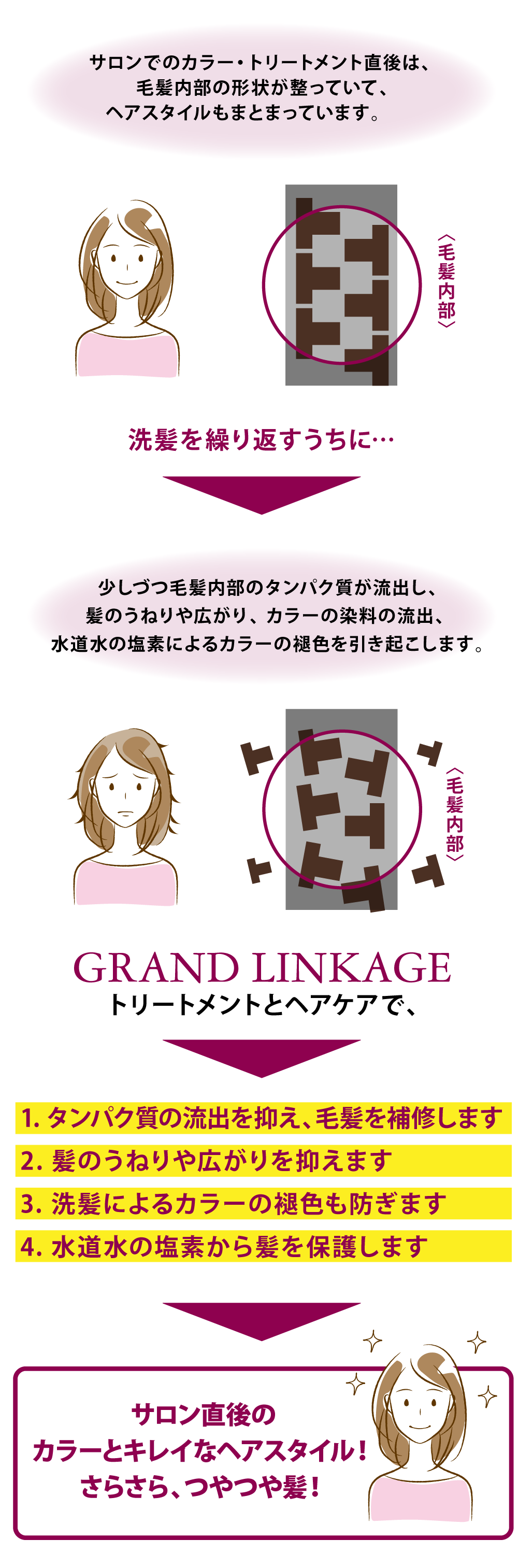 GRAND LINKAGE(グランドリンケージ)シリーズは、カラーやパーマで崩れた毛髪内部のタンパク質を新たに結合することで、強い毛髪にします。修復された毛髪は半永久的にタンパク質の形成&形状記憶が持続します。
