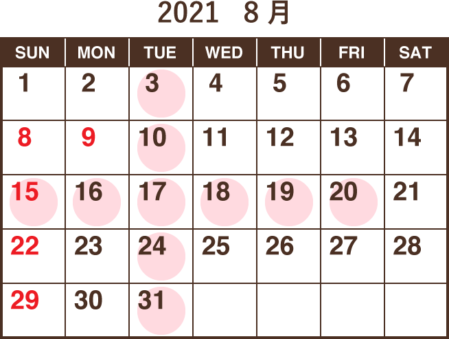 8月は、15日(日)から20日(金)と毎週火曜日はお休みとさせていただきます。