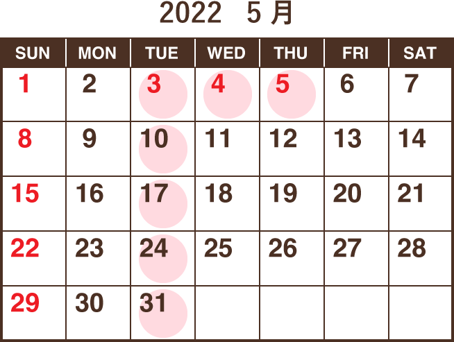 5月のゴールデンウィーク中の定休日は3日(火)、4日(水)、5日(木)はお休みとさせていただきます。15日(日)、16日(月)は通常はお休みですが、営業致します。